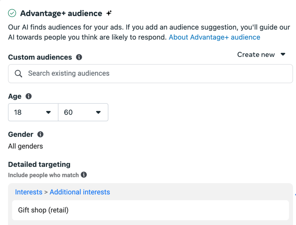 The Scandi Shoppe is for shoppers of all kinds, young, old, men, women, the audience is very broad. So that gives a pretty big range to focus on. With so much to offer, we are looking at an age range of 18-60 of all genders. Additionally, I have added detailed targeting for “gift shop” in efforts to maximize how many potential shoppers we can grab the attention of.