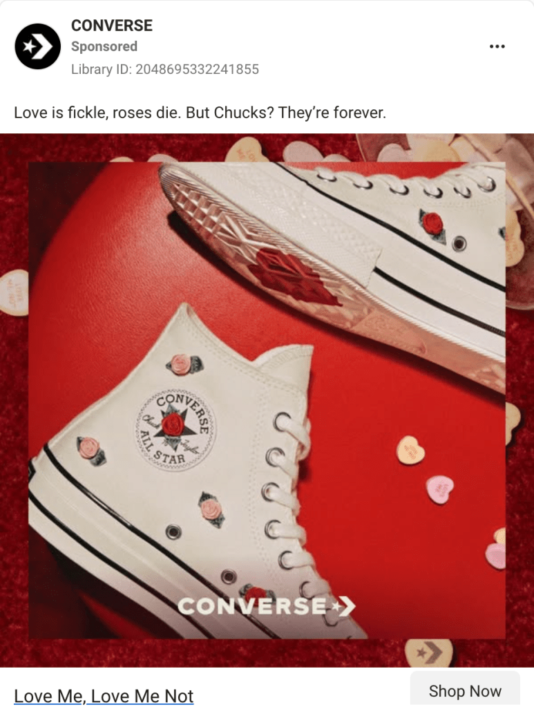 Converse’s “Love Me, Love Me Not” Valentine’s Day campaign isn’t just about celebrating self-love and individuality—it’s strategically designed to drive conversions. By showcasing eye-catching designs, Converse aims to capture attention and encourage quick purchases aka conversions.